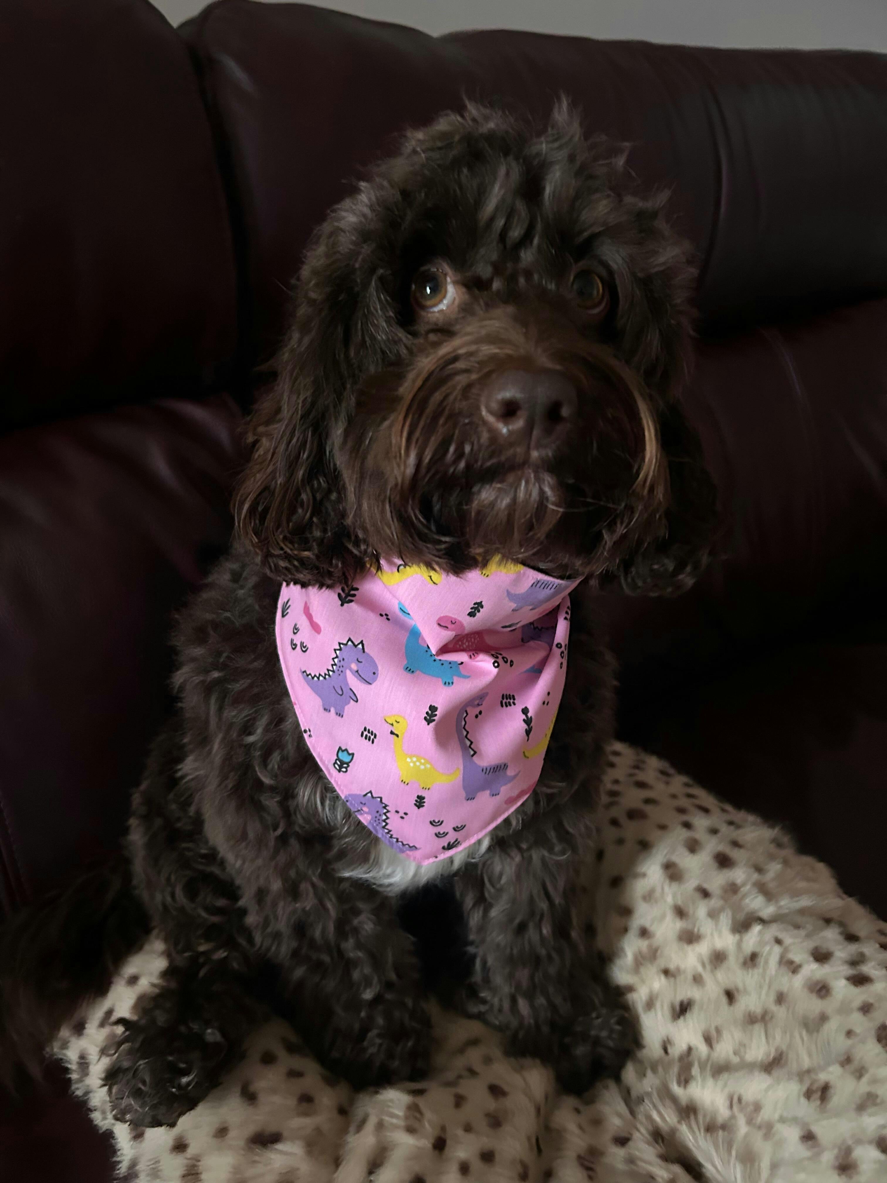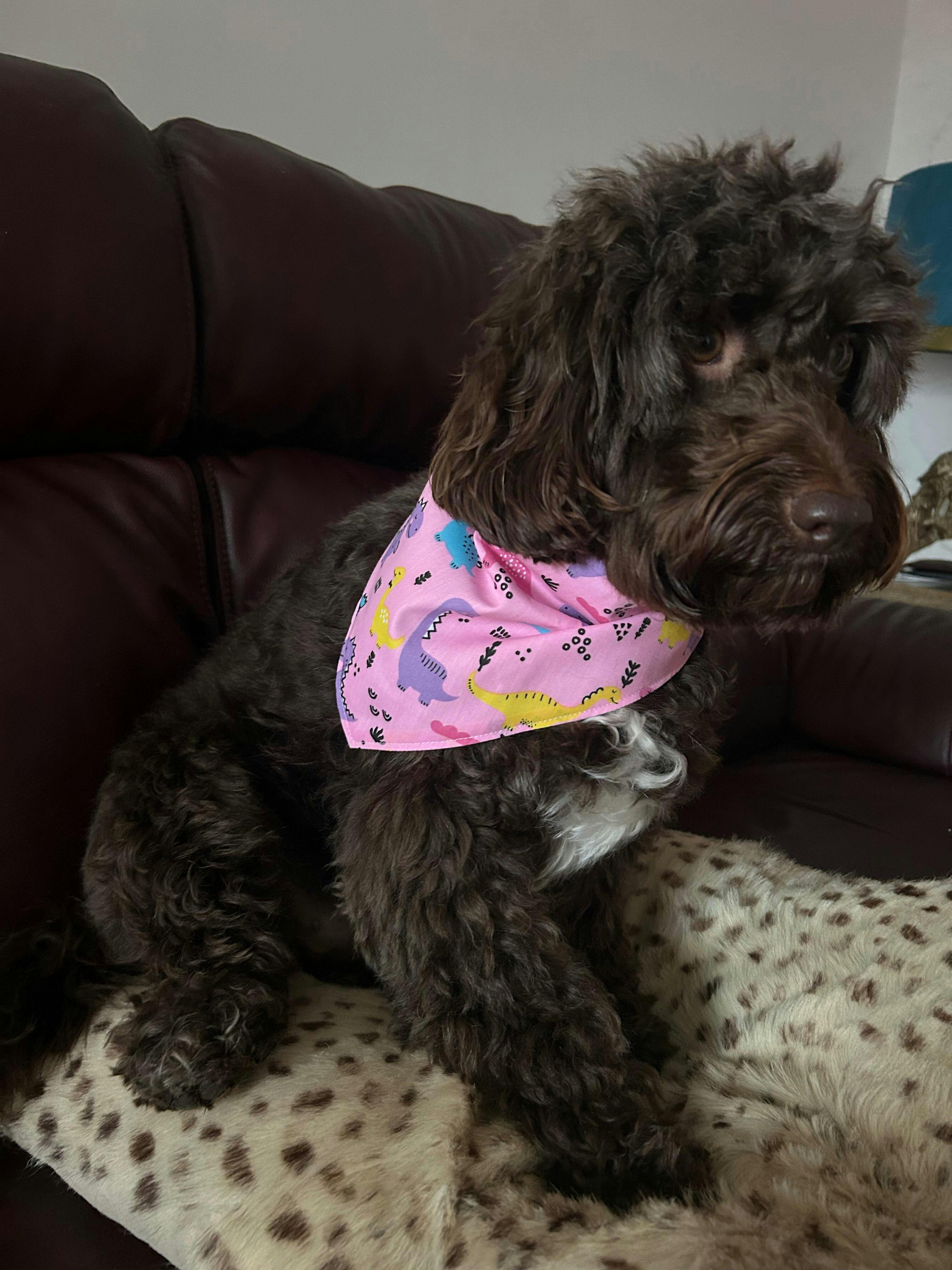 A beautiful bandana yet again ! Always great quality. Excellent communication and I have the best dressed dog in her new pink dinosaur ( cause girls like dinosaurs too ) birthday bandana. Can’t thank you enough xx